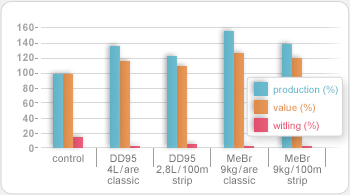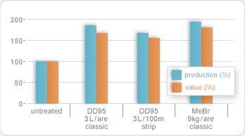 Classic (i.e. full area) fumigation: 06.07.1995; Strip fumigation in combination with black plastic film sealing: 17.07.1995; Planting date: 10.08.1995. Methylbromide (MeBr) was still used at the former high standard dose of 9 kg/are. Verticillium pressure was low.